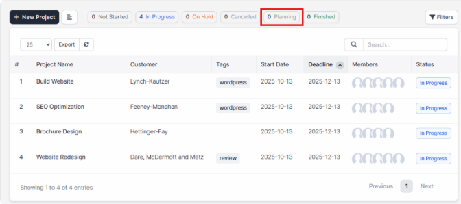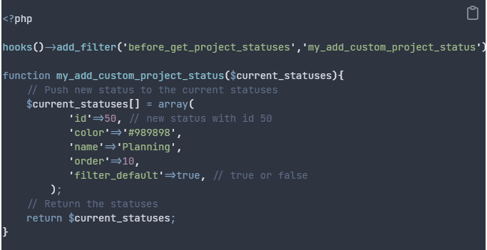 - filter_default – Controls whether projects with this status are shown by default in list tables. If set to false, those projects are excluded from the default view and must be included manually using filters; if true, they appear in the default listing.
