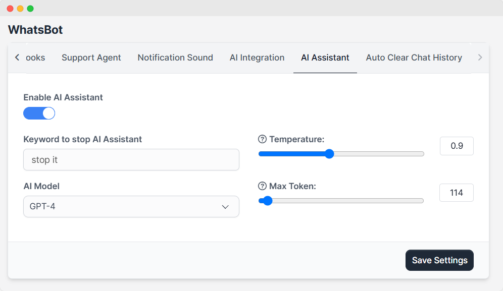 The AI Assistant Settings allow you to configure and customize the behavior of the AI assistant integrated into the WhatsBot module. This guide will help you understand each option and configure the settings for optimal performance.