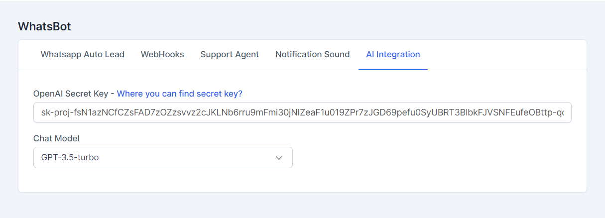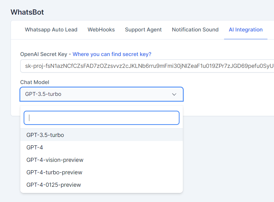 The AI Integration feature allows users to enhance their WhatsBot experience by integrating AI capabilities such as language translation, tone adjustments, and grammar corrections. This feature leverages various OpenAI models, providing a range of options to tailor the AI's behavior according to your needs.