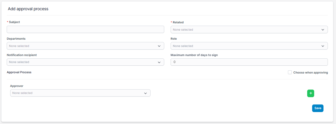 Direct manager, Department manager are only displayed when HR Record module is active. - Click to add another approver to the process