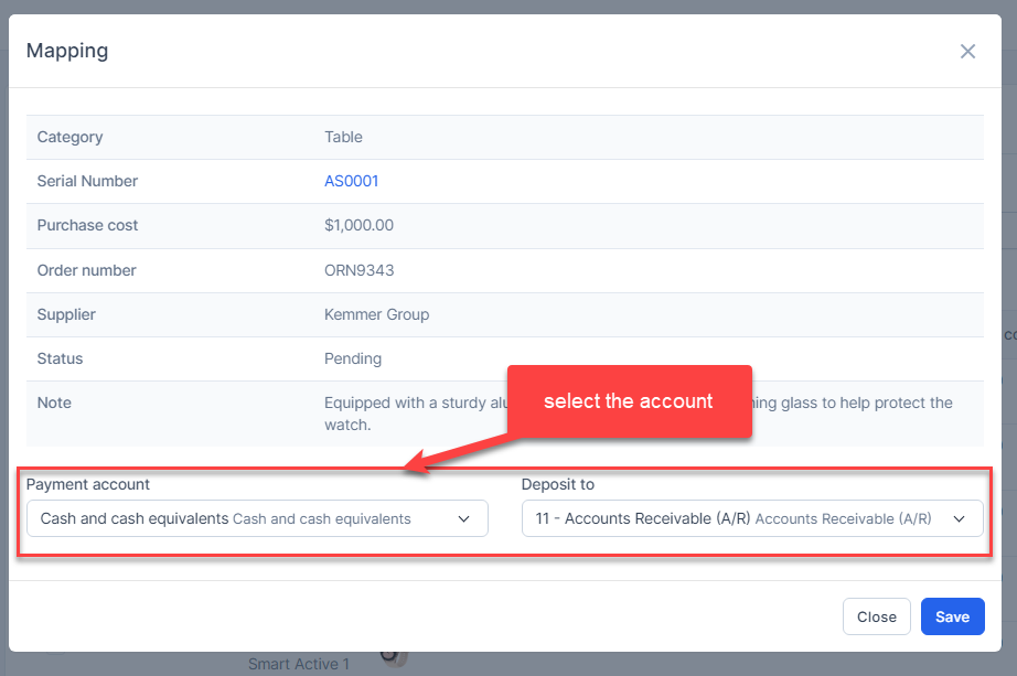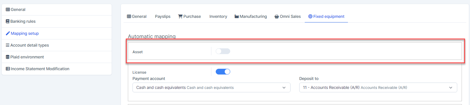- Step 1. Go to Settings menu under the Accounting module in the left sidebar -> Select the Mapping setup menu -> Select the Fixed equipment tab -> Enable the Asset mapping setup and select the payment account and deposit to then click on the Save button