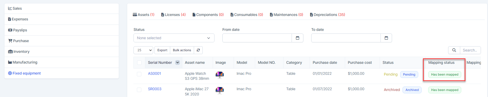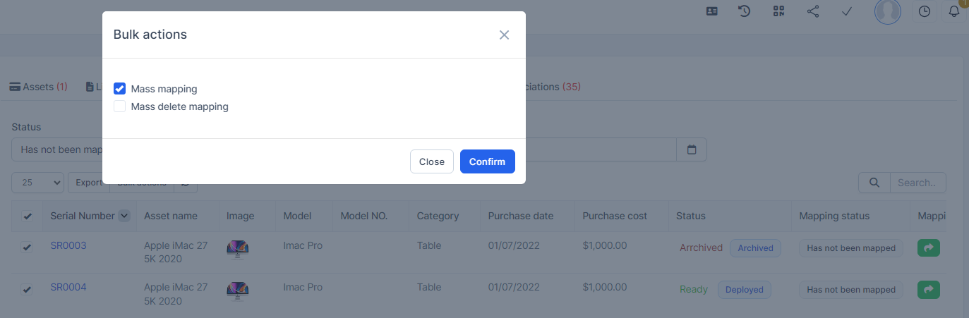 - Step 2. Go to Transactions menu under the Accounting module -> Fixed equipment -> Assets -> Select the asset which mapping status is Has not been mapped -> click on the Bulk actions -> select the Mass mapping -> click on the Confirm button