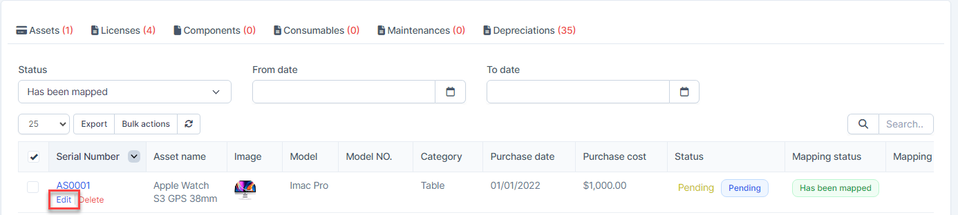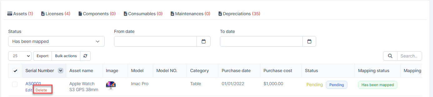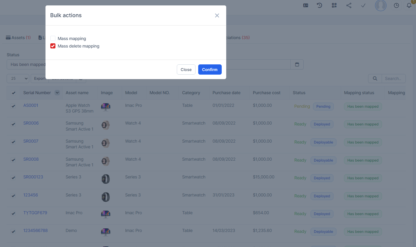 - Step 1. Go to Transactions menu under the Accounting module -> Fixed equipment -> Assets -> Select the asset which mapping status is Has been mapped -> click on the Bulk actions -> select the Mass delete mapping -> click on the Confirm button