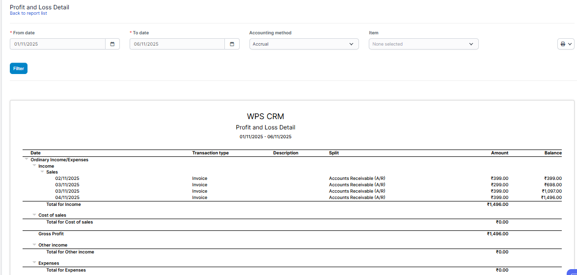 Gross Profit by Product: This report helps users calculate Gross Profit per individual product by filtering transactions based on the selected item. It allows tracking profitability at the item level, essential for sales and cost analysis.