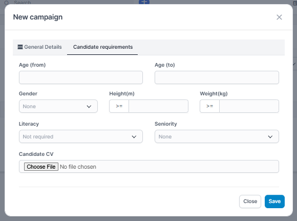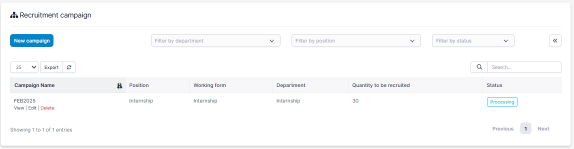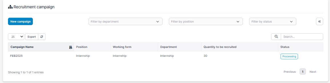 - Step 1. Go to Campaign menu under Recruitment module from the left sidebar -> click New campaign button.