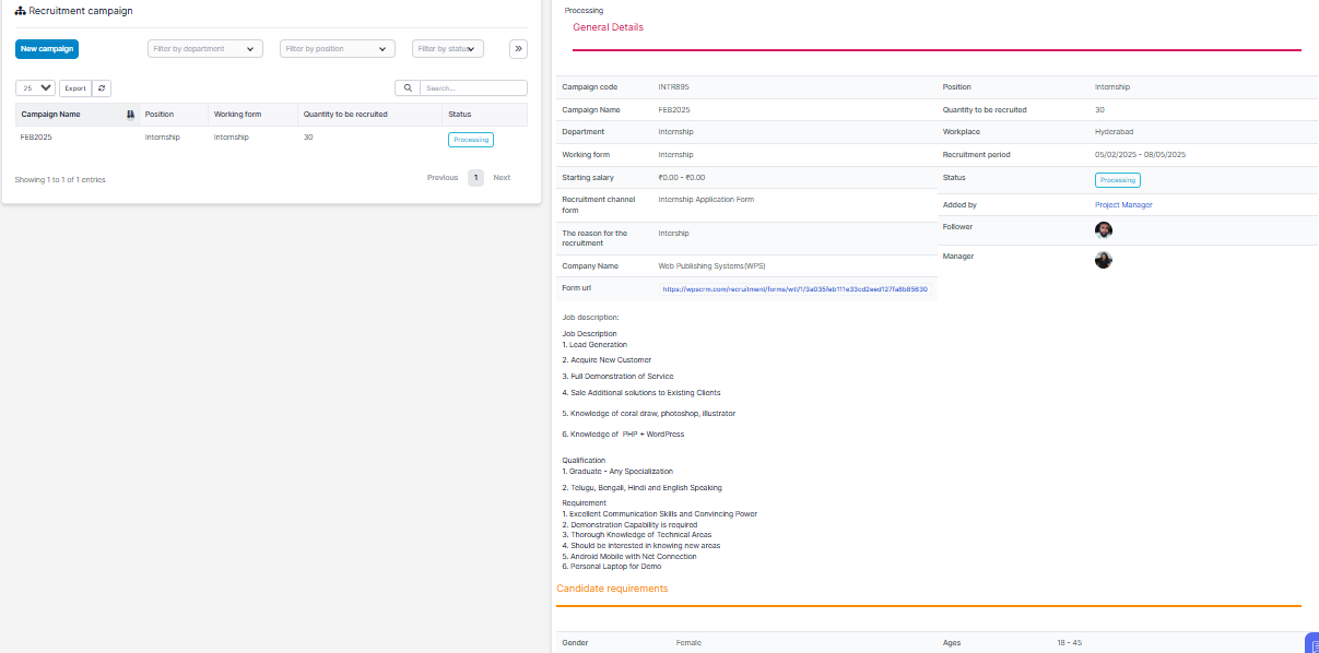 - Step 1. Go to Campaign menu under Recruitment module from the left sidebar