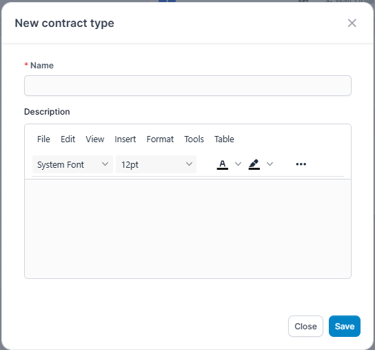 - Step 2: The system will open a screen called New contract type -> We proceed to enter data -> Then select SAVE to save the operation or select Close to close the screen and cancel the operation just done.