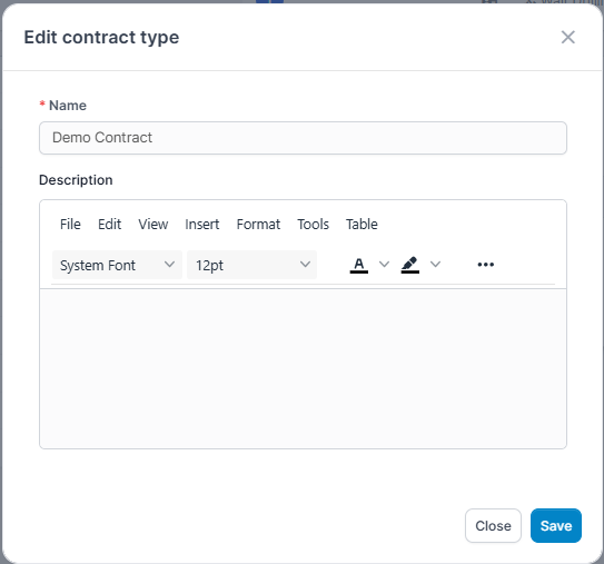 - Step 2: The system will display the Edit contract type screen -> Proceed to edit the data of the contract type -> Then click Save to save the operation or select Close to close the screen and cancel the operation just performed.