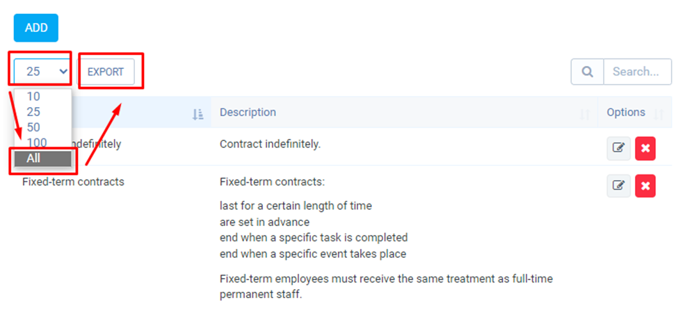 Method 1: To export all data of Contract type -> select display function -> Select All -> System will display all data contained in Contract type -> Then select Export function-> Select file type you want to export.