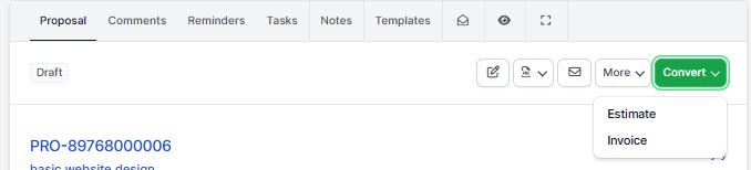 To convert proposal to invoice or estimate select the proposal from the table and on the right side a convert button will be shown