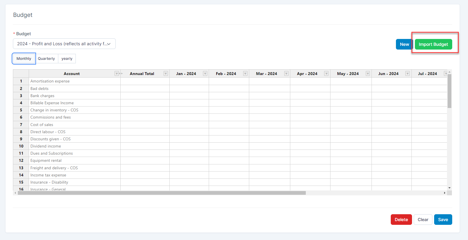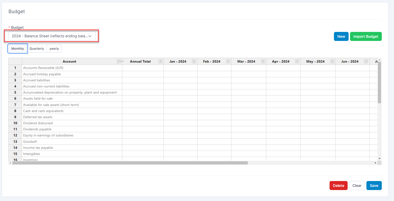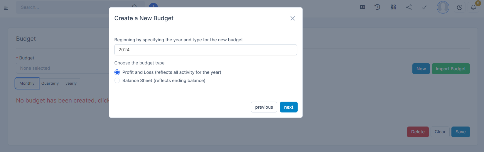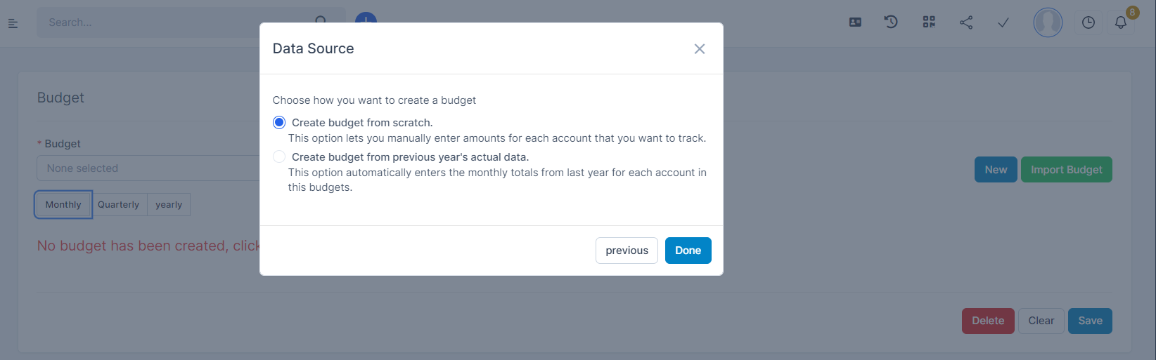 - If you select Profit and Loss, select either Create budget from scratch or Create budget from previous year's actual data -> Select Done