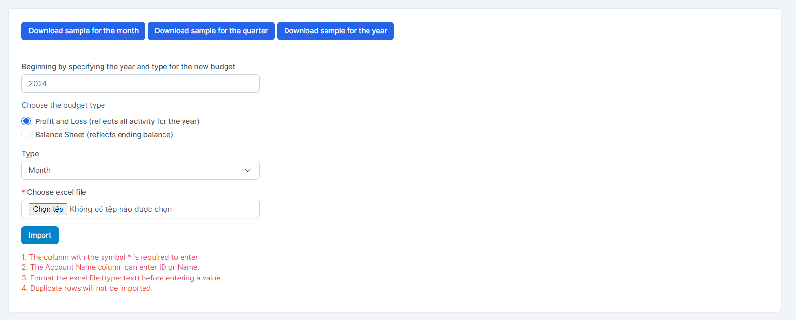 - Step 4. Enter a year at Beginning by specifying the year and type for the new budget -> then choose either Profit and Loss or Balance Sheet -> select a type -> Click the Choose File button under Choose excel file and choose a file -> click on the Import button