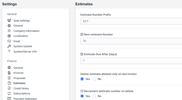 Sale Agent – You can select sale agent for this estimate then generate reports in Reports->Sales->Estimate Report. Note that the sale agent full name will be shown on the estimate if in Setup->Settings->Finance->Estimates -> Show sale agent on estimate is set to yes.