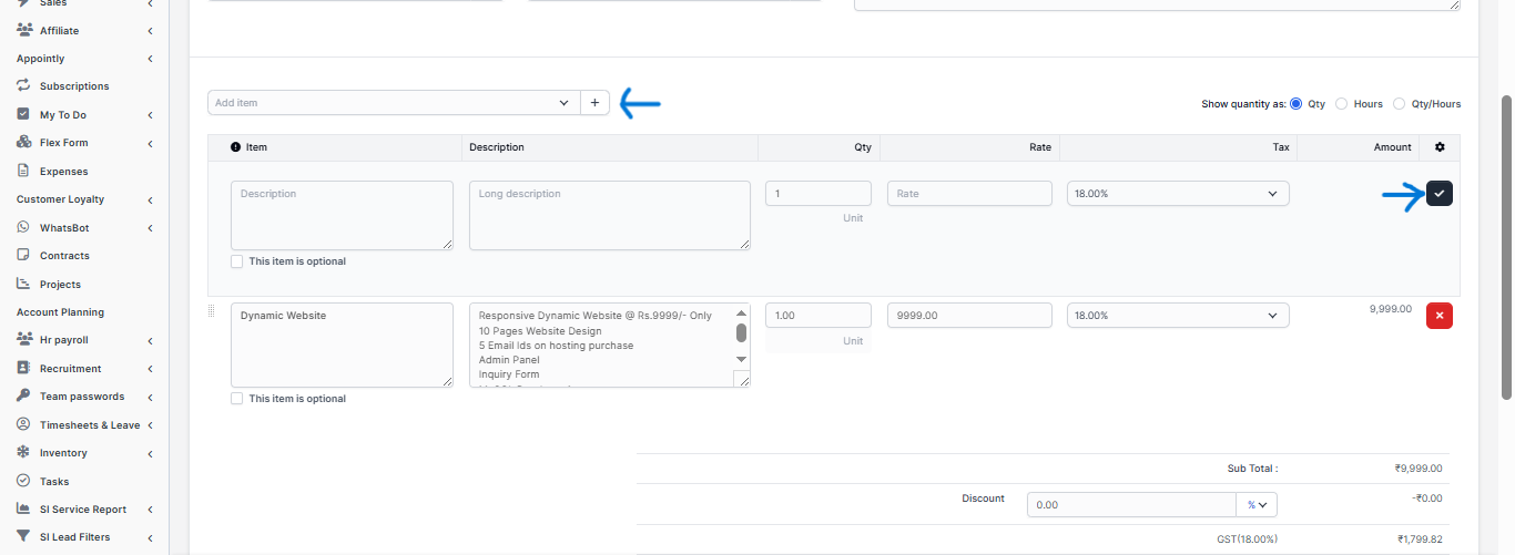 You can add Estimate items, when adding make sure u click on the blue check icon in order the item to be added you can also select tax options see shown in picture.
