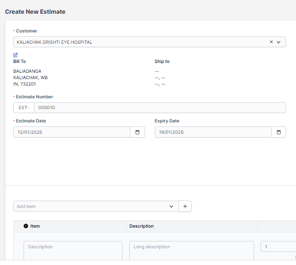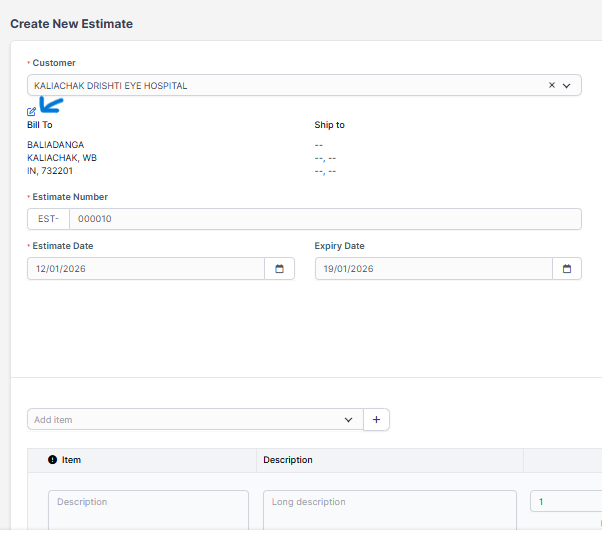 Billing and Shipping – If you change the billing and shipping informations after slecting a client and click on the edit icon, this will be changed for the Estimate but in the customer profile the informations will remain the same and wont be any changes in the Invoice.