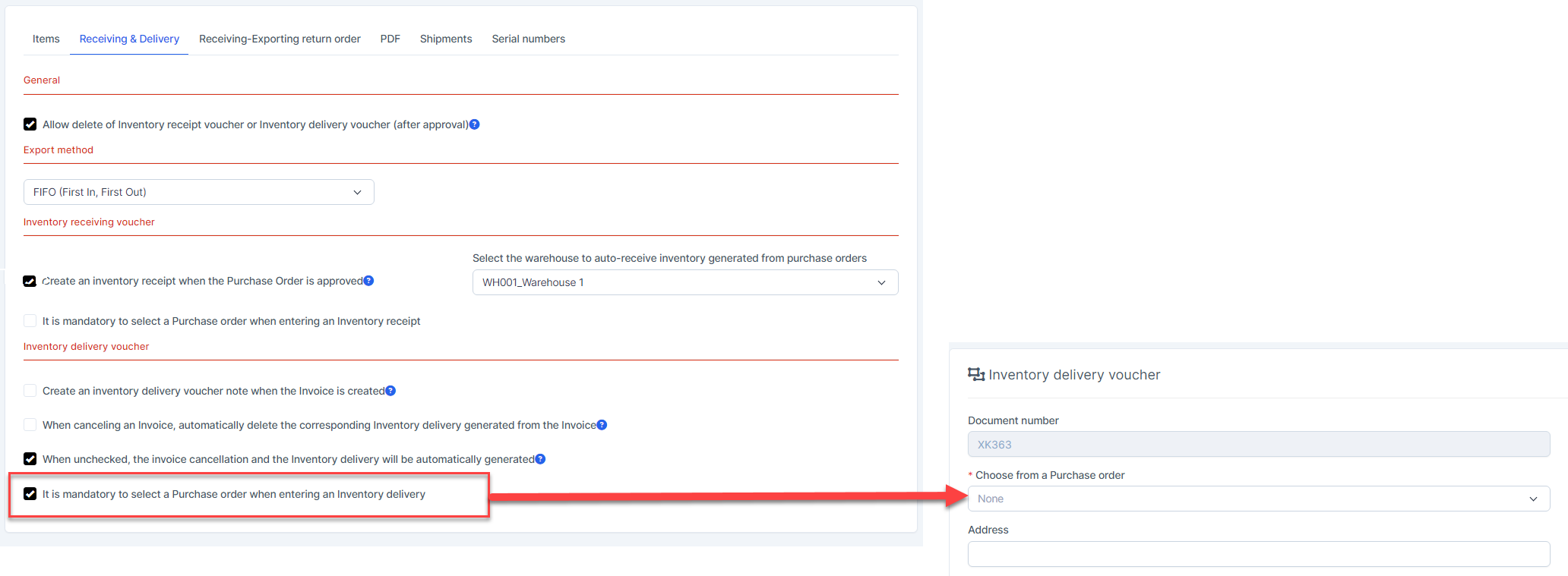You can create inventory delivery voucher by selecting invoice or available items or Purchase order ( if "It is mandatory to select a Purchase order when entering an Inventory delivery" is activated at General Setting - Receiving & Delivery. Purchase orders that have been approved and status is Completely Delivered will be selected to generate the inventory delivery voucher).