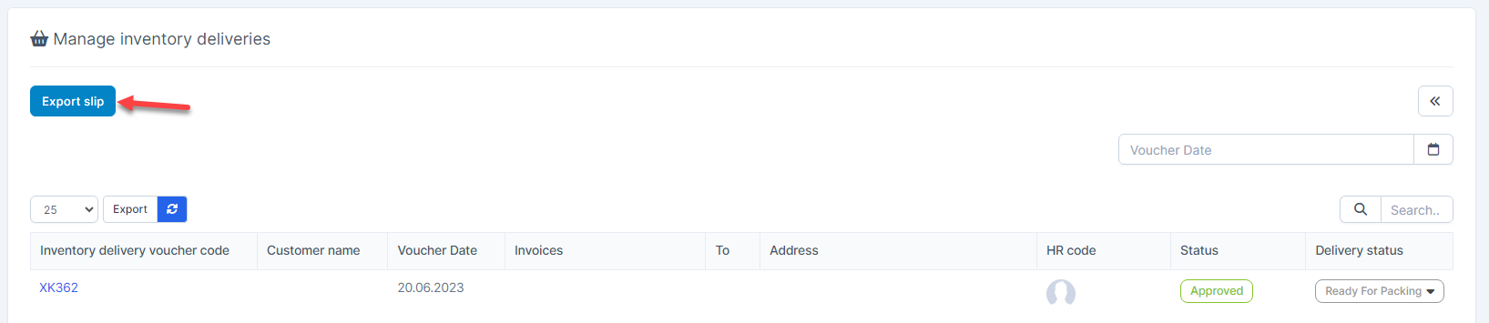 - Step 2. Go to Inventory delivery voucher menu under Inventory module from the left sidebar -> click Export slip button