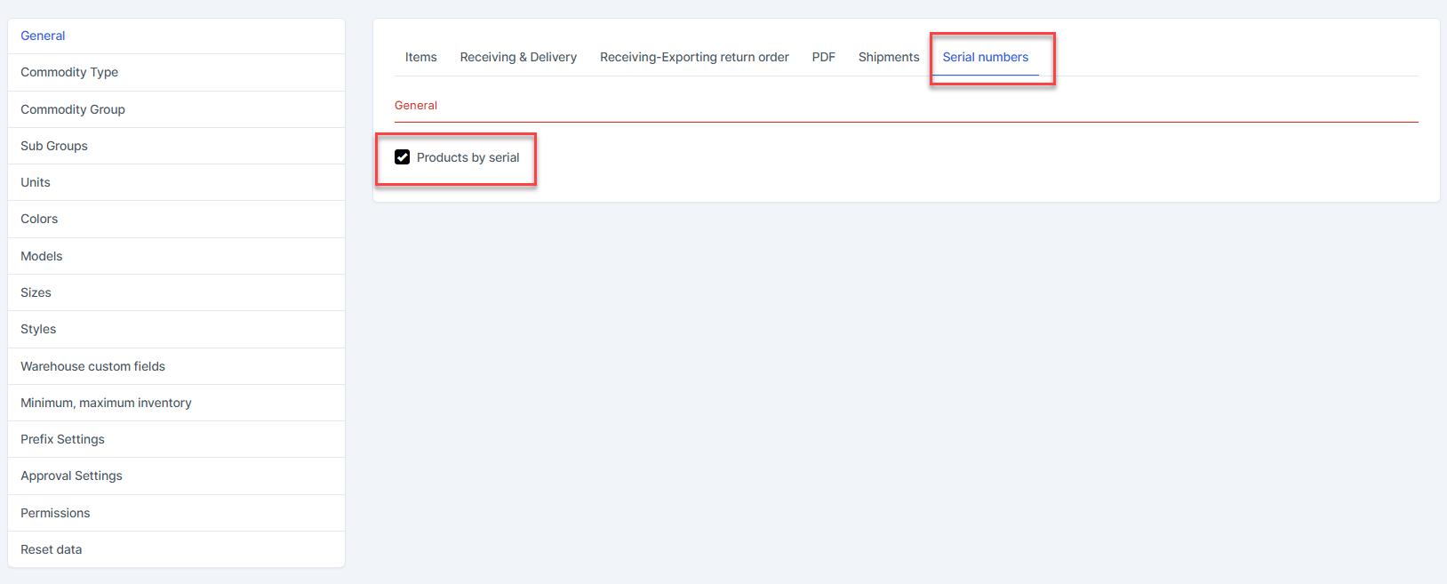 - Step 1. Go to Settings menu under Inventory module from the left sidebar -> Select General -> Select Serial numbers -> Enable Product by serial