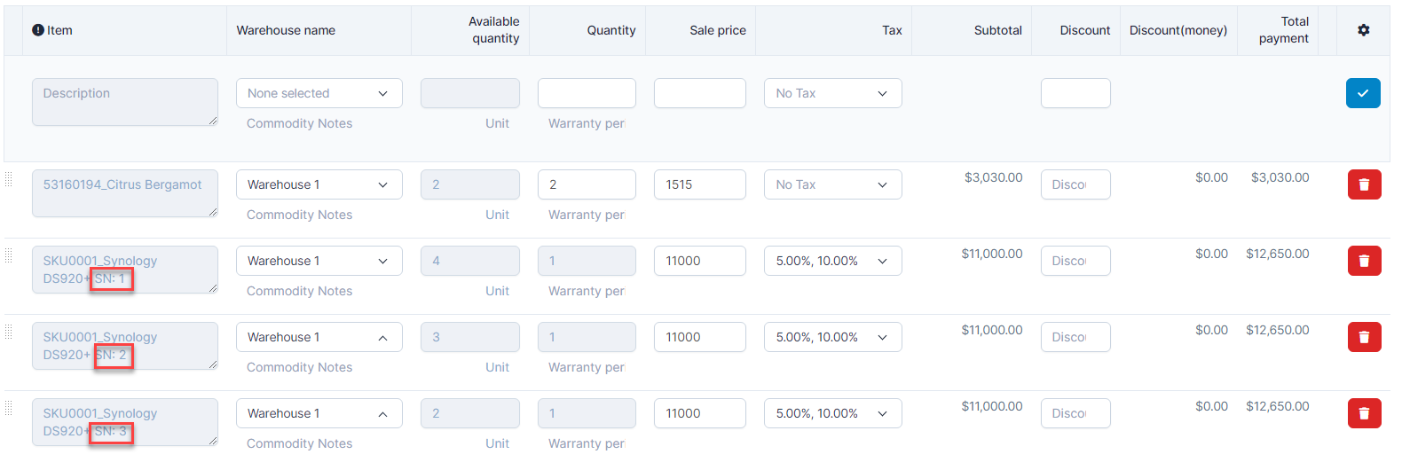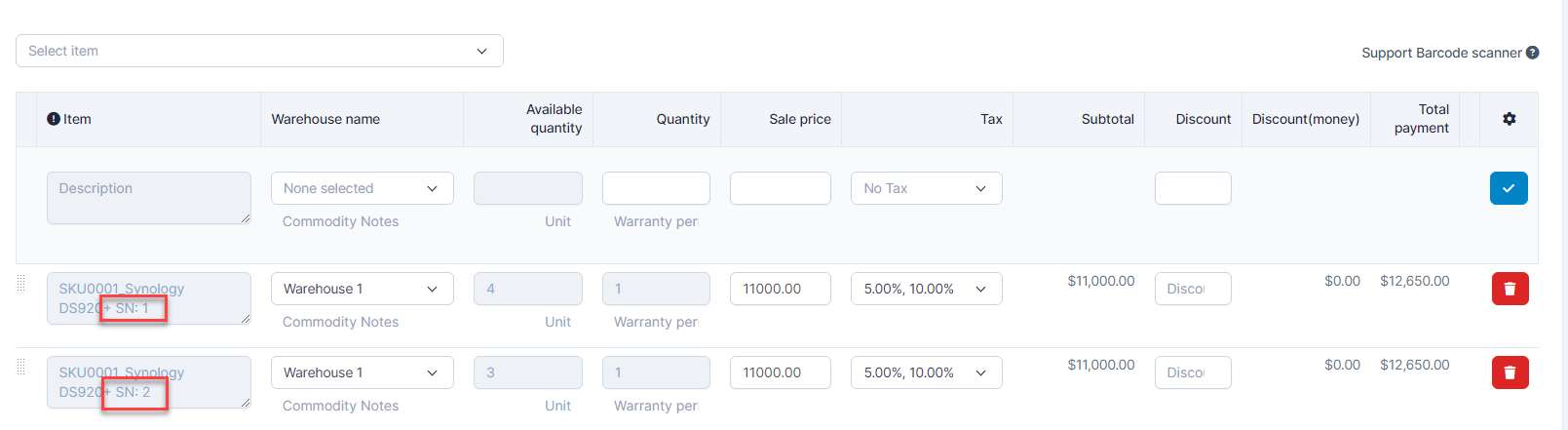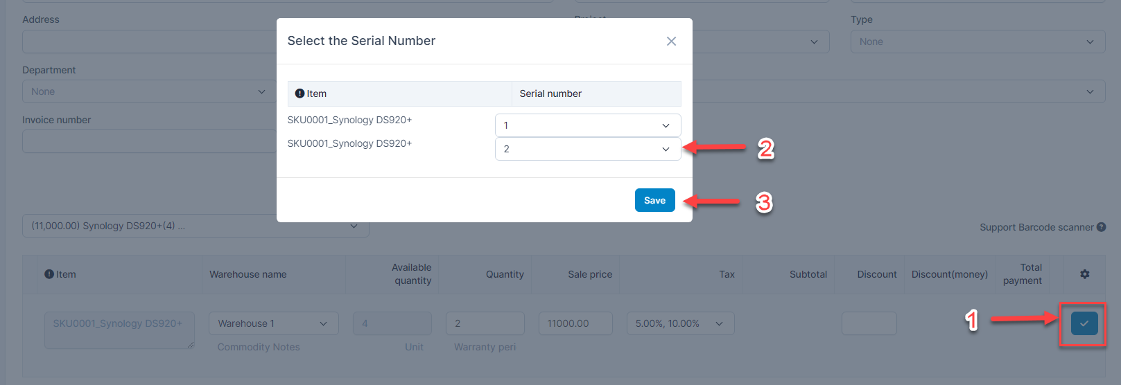 - Step 2. In the Add Inventory delivery voucher page, select the available item -> click blue tick mark -> Select the serial number -> click Save button.