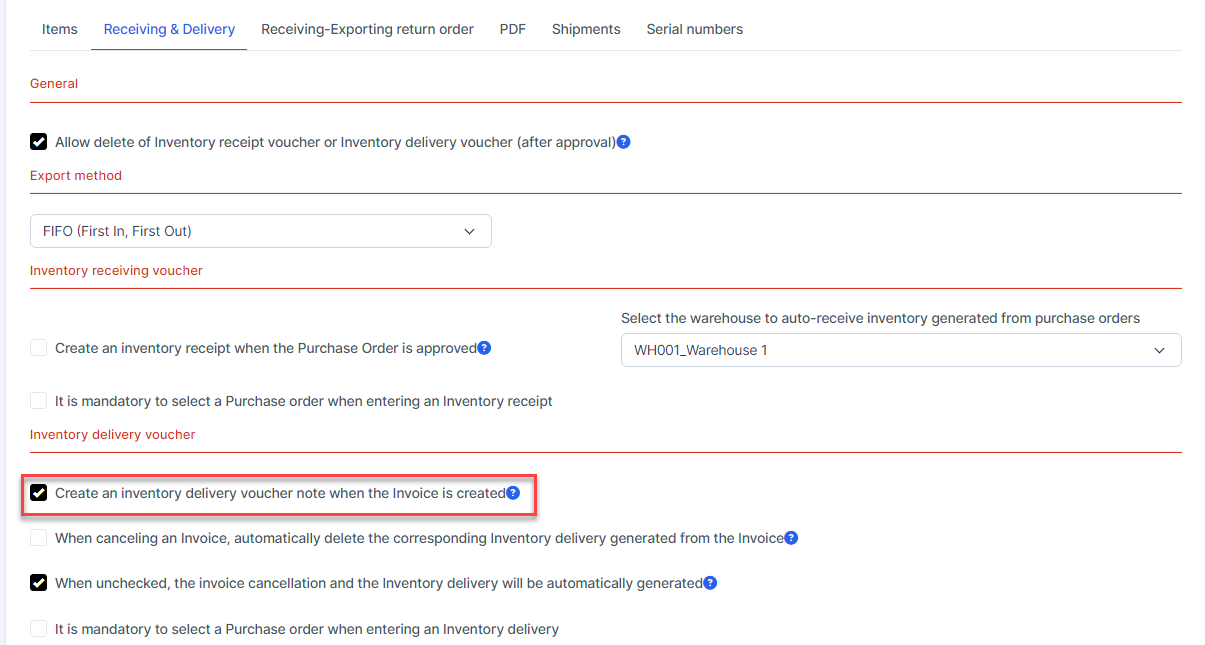 Go to menu Settings -> Receiving & Delivery tab-> check option “Create an inventory delivery voucher note when the Invoice is created: Inventory delivery voucher will be automatically created as soon as invoice is generated.