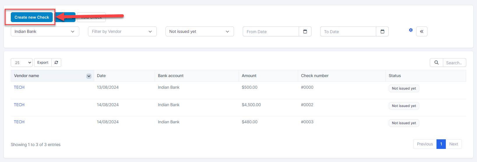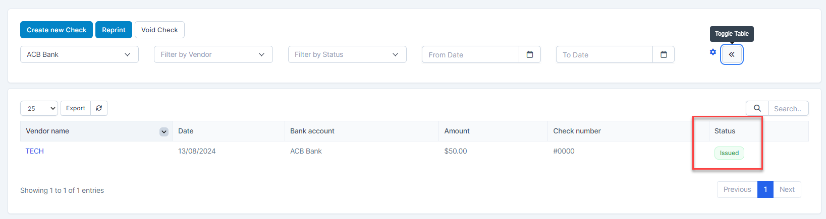 Step 4. Select a Bank account. the system automatically displays the next check number of the selected bank account, default starts with 0. Then select a vendor at Pay to the order of and enter the total amount paid