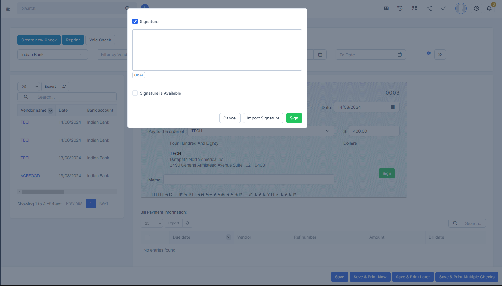 Note: The condition for displaying the Sign button is that "Show 2 Signatures" in Configure Checks is not enabled.