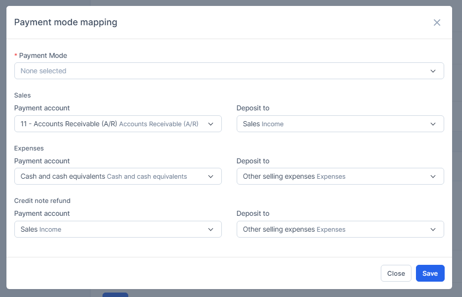 Step 1. Go to Settings menu under the Accounting module in the left sidebar -> Select the Mapping setup menu -> Select the General tab -> Enable payment mode mapping