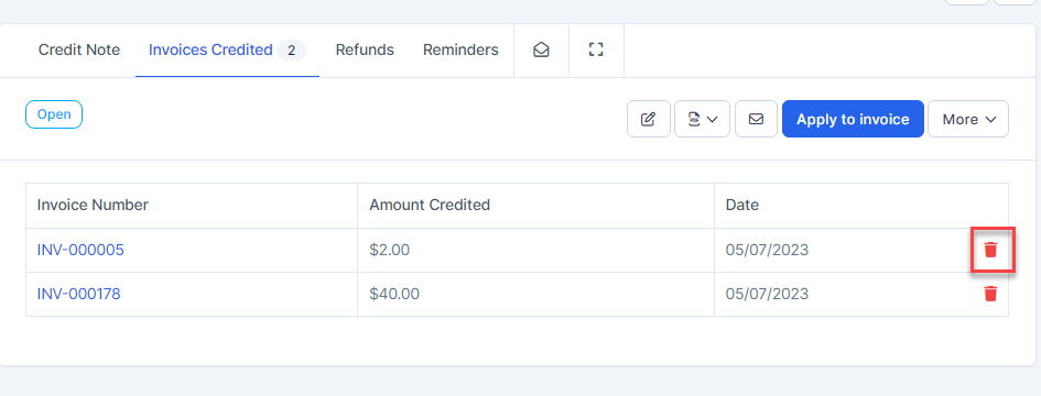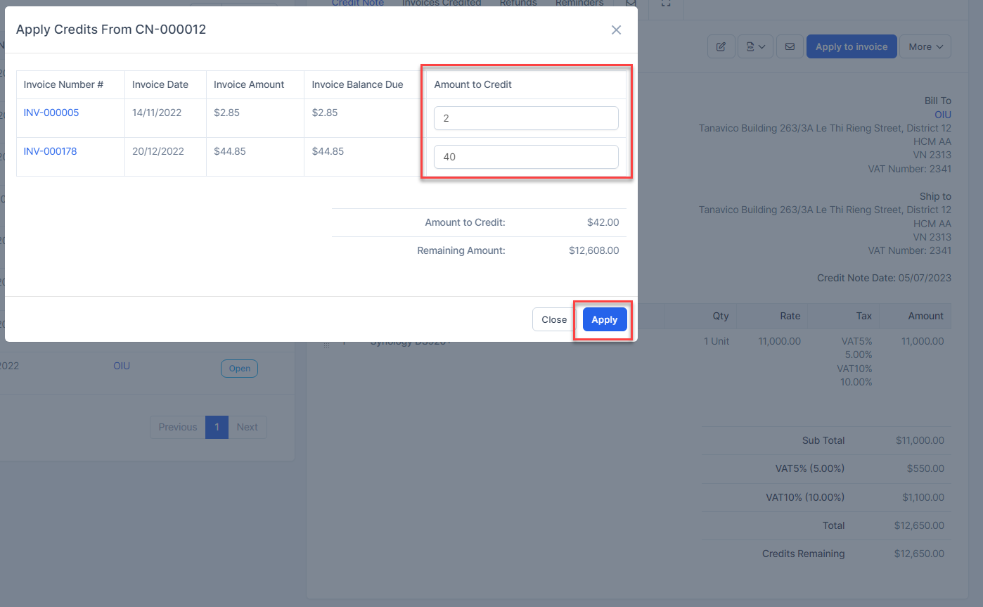 Step 4. In the credit note page detail -> Click on the Apply to invoice -> enter the Amount to Credit and click on the Apply button
