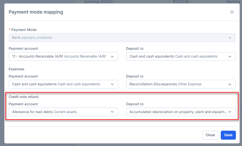 NOTE: If the Credit note refund mapping is disabled, credit note refund cannot be mapped to account.