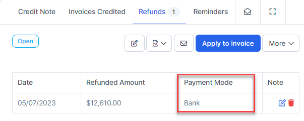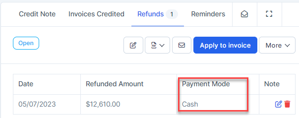 Step 2. In the credit note page detail -> Click on the More -> click on the Refund button.
