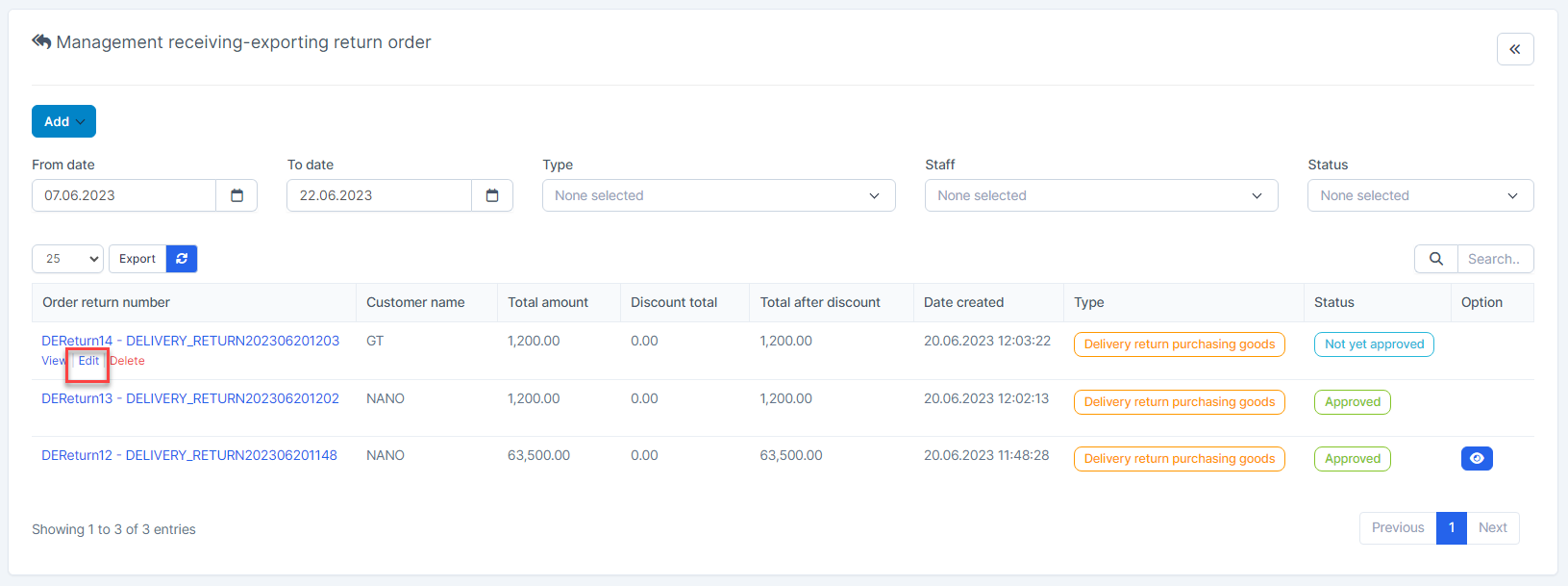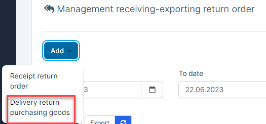 - Step 2. Go to Receiving-Exporting return order menu under Inventory module from the left sidebar -> click Add button -> Select Delivery return purchasing goods