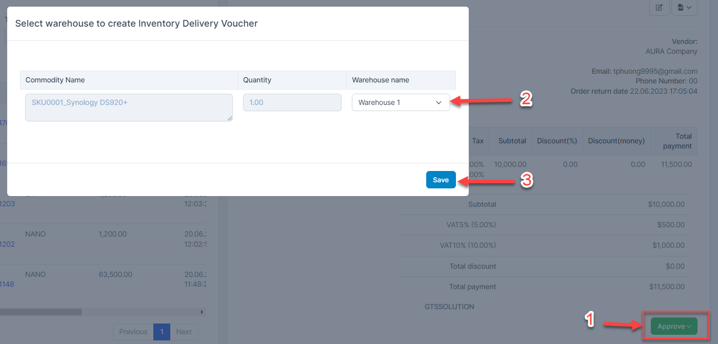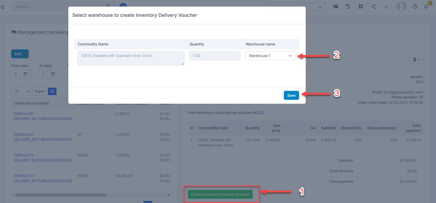 Save button: used to save delivery return purchasing good but does not send a request for approval.- Delivery Return Purchasing Goods with no approval process: Delivery Return Purchasing Goods automatically approve -> Go to Delivery Return Purchasing Goods detail -> click Create Inventory Delivery Voucher button -> In the Select warehouse to create Inventory Delivery Voucher, select the Warehouse name