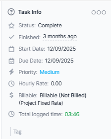 - Logged Hours – Shows total logged project hours Billable and Not Billable