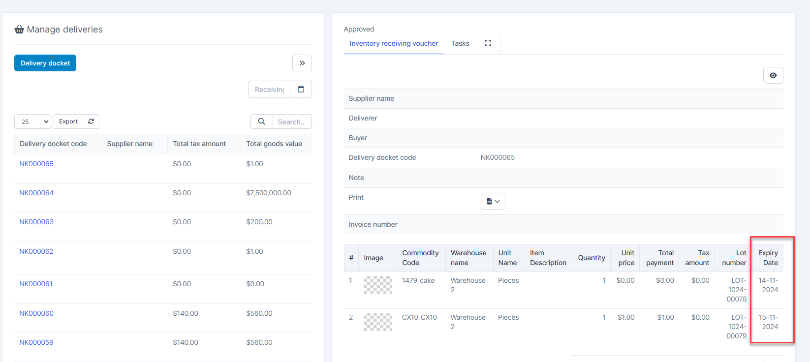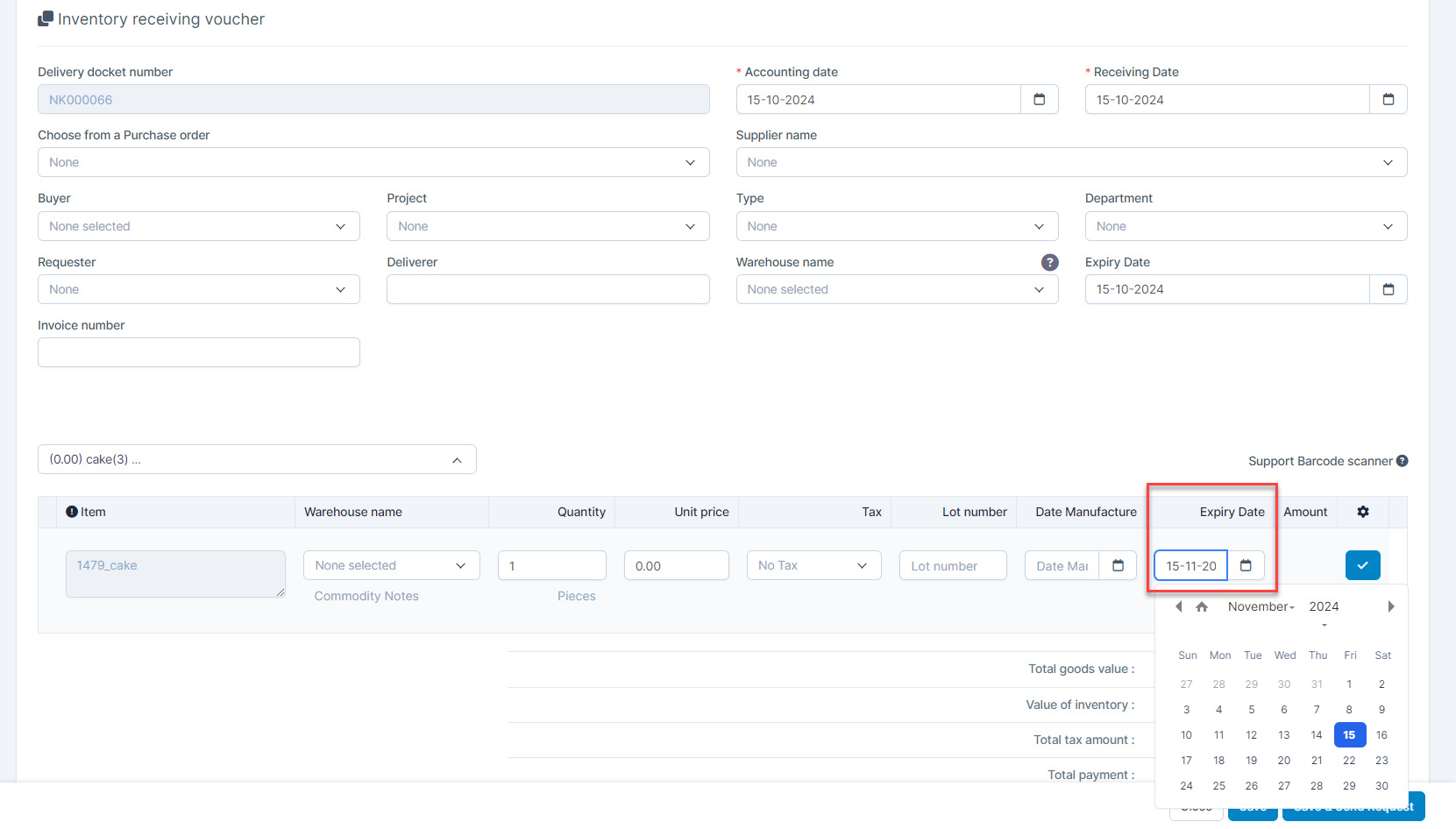 + Then create inventory receiving voucher and select the expiration date in the Expiry Date column.