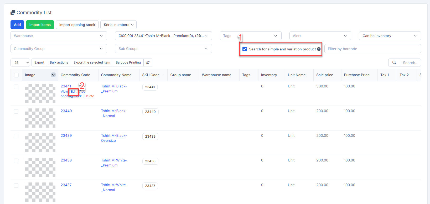 - First, to display variant products, check the "Search for simple and variation product" option on the Commodity List