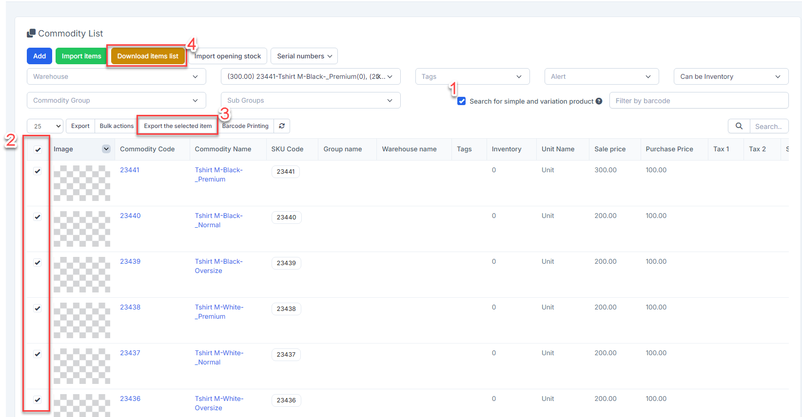 Step 1. Go to Commodity List -> check the "Search for simple and variation product" option on the Commodity List -> select some items and click on "Export the selected item" -> then click on Download items list button