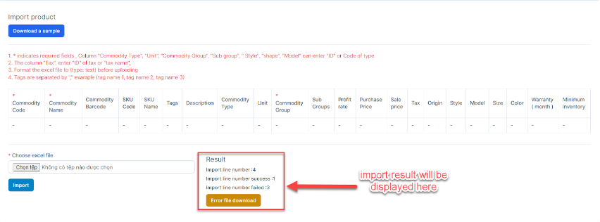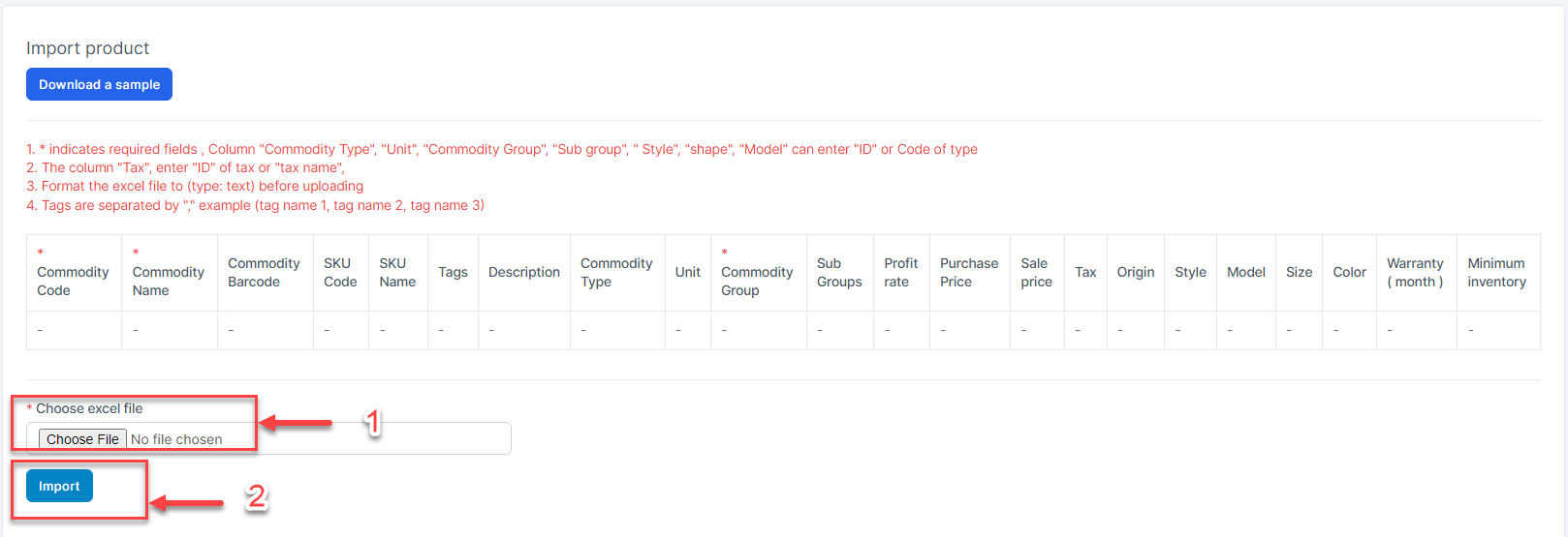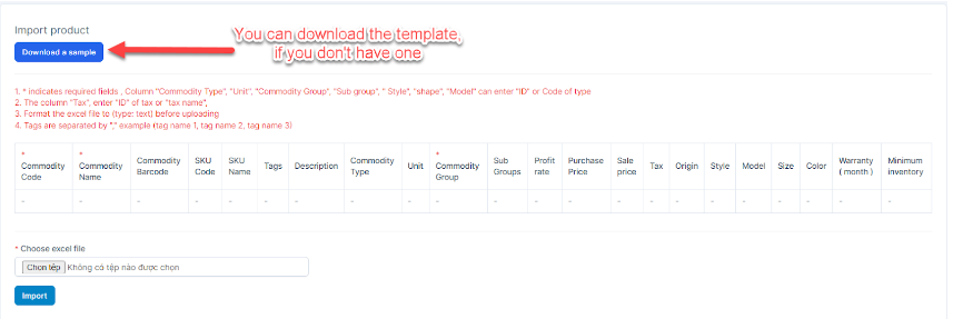 - Step 3. To ensure successful import (correct format, full columns) you should download the template file by clicking Download a sample button.