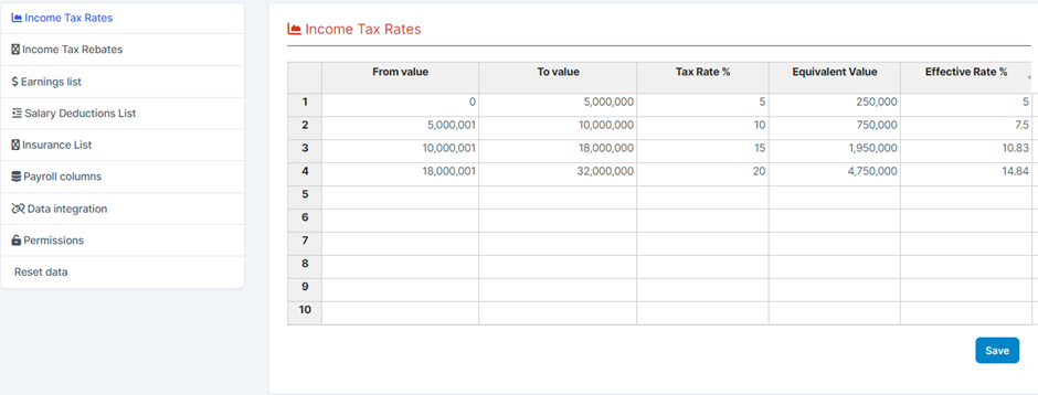 Select the HR Payroll Module -> Select Income Tax Rates -> Enter the values for the fields -> Click Save to save the data you just manipulated. The data input in this screen will be used for the Income taxes screen which is used to calculate the employee's personal income tax