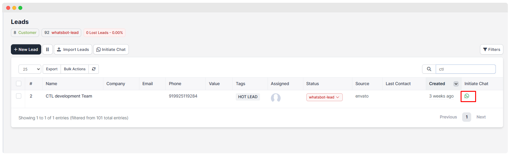 - You can access this feature from the Leads list by clicking the green WhatsApp icon under the Initiate Chat column next to the respective lead.