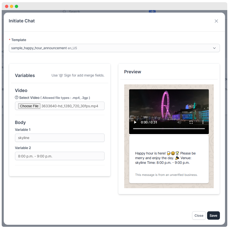 - Fill Template Variables: Enter dynamic values for placeholders within the message template (e.g., venue name, timing).
