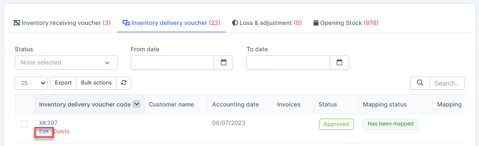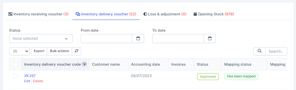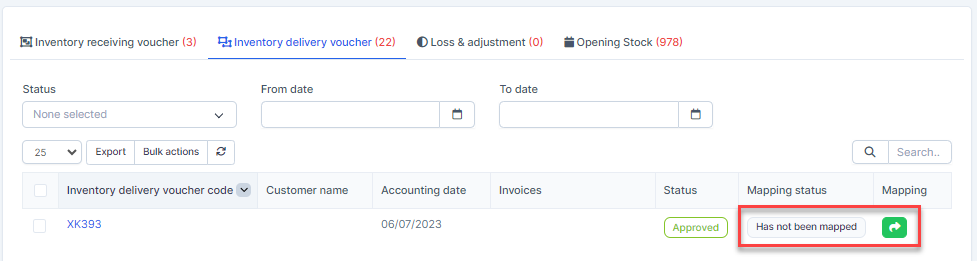 - Step 2. Go to the Transactions menu -> Inventory -> Inventory delivery voucher -> Select the inventory delivery voucher which mapping status is Has not been mapped -> click on the Bulk actions -> select the Mass mapping -> click on the Confirm button.