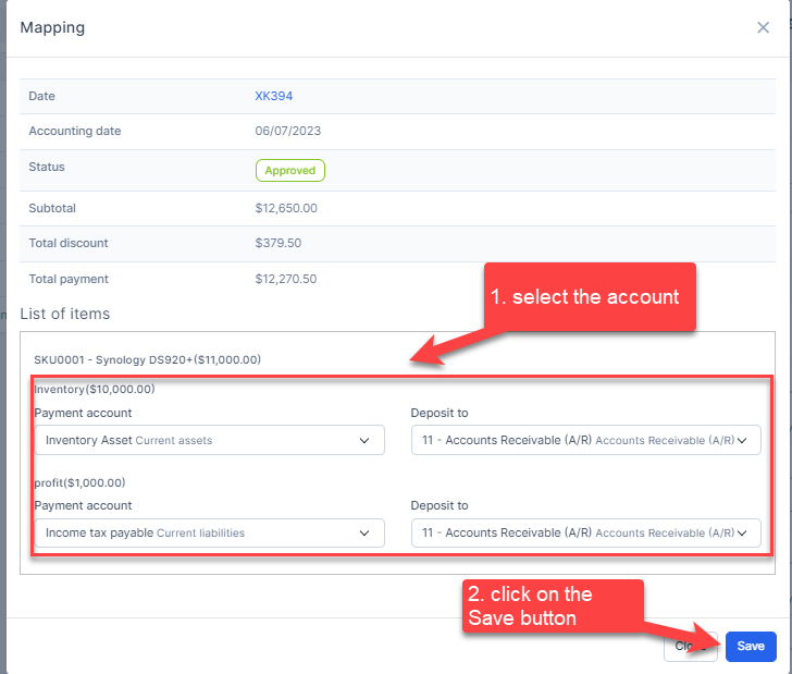 - Step 1. Enable the Inventory delivery voucher mapping setup and select the payment account and deposit to -> Click on the Save button