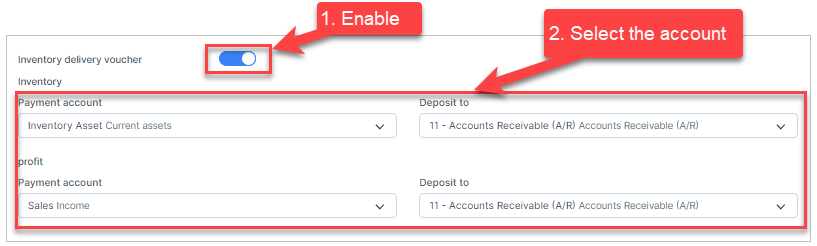 - Step 1. Go to Settings menu under the Accounting module in the left sidebar -> Select the Mapping setup menu -> Select the Inventory tab -> Enable the Inventory delivery voucher mapping setup and select the payment account and deposit to -> Click on the Save button