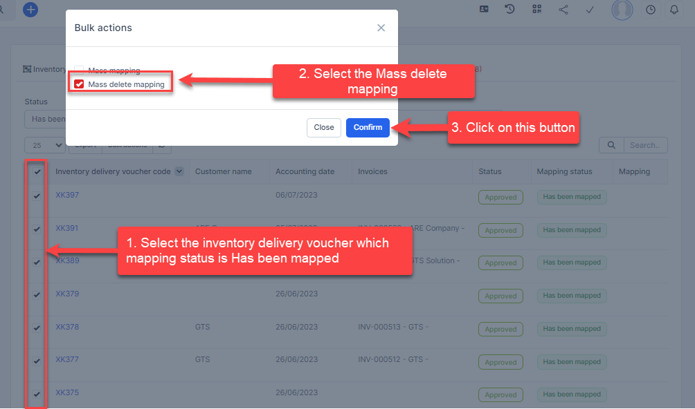 - Step 1. Go to the Transactions menu -> Inventory -> Inventory delivery voucher -> Select the inventory delivery voucher which mapping status is Has been mapped -> click on the Bulk actions -> select the Mass delete mapping -> click on the Confirm button