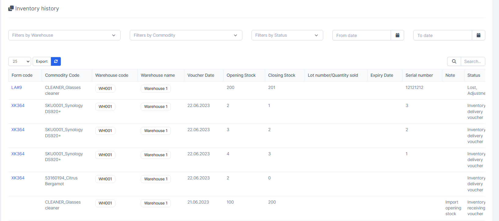 Inventory history: records all transactions related to changes in product inventory: “Inventory receiving voucher”, “Inventory delivery voucher”, “Internal delivery note”, “Loss & Adjustment”.