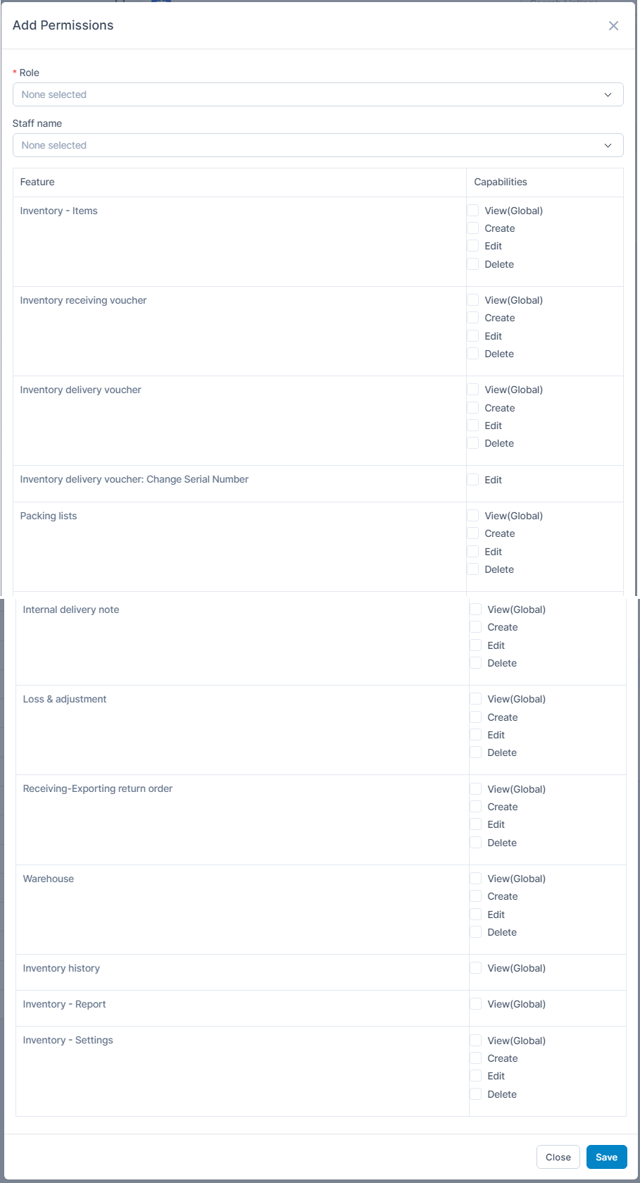 - Inventory Delivery Voucher-Change Serial Number: If voucher is not yet approved, employee with this permission can change the serial number for delivery.