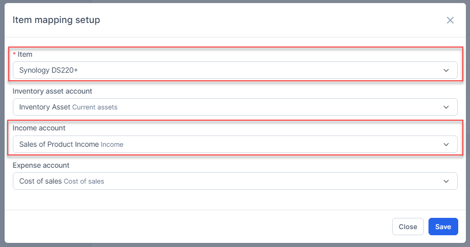 - Synology DS220+ mapped to accounts under Item mapping setup