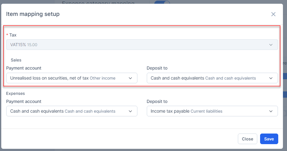 - VAT 15% mapped to accounts under Tax mapping setup