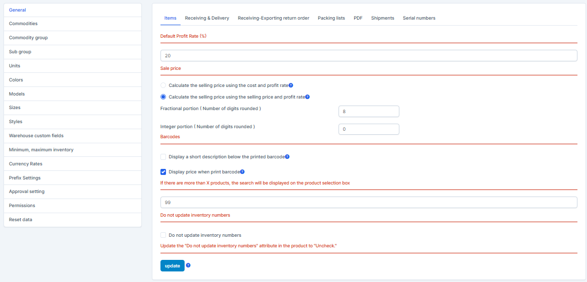 Go to Settings menu under Inventory module from the left sidebar -> Select General Settings -> Items tab