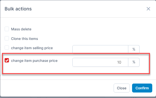 Adjust the purchase price of multiple items at the same time by a certain percentage